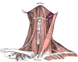 The site of insertion is situated immediately superior to that of the superior belly of omohyoid muscle.[3]