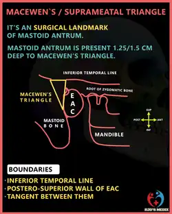 In the temporal bone, between the posterior wall of the external acoustic meatus and the posterior root of the zygomatic process is the area called the suprameatal triangle, suprameatal pit, mastoid fossa, foveola suprameatica, or Macewen's triangle, through which an instrument may be pushed into the mastoid antrum.