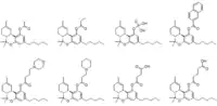 THC acetate ester (THC-O or THCOA) can be synthesized from THC,[2][3] or from THCA. The acetylation of THC does not change the properties of the compound to the same extent as with other acetate esters, as the parent compound (THC) is already highly lipophilic, but potency is nonetheless increased to some extent. While the acetate ester of Δ9-THC is the best studied, the acetate esters of other isomers, especially Δ8-THC but also Δ10-THC are also known, as are other esters such as THC-O-propionate, THC-O-phosphate, THC hemisuccinate, THC hemiglutarate, THC morpholinylbutyrate, THC piperidinylpropionate,[4] THC naphthoyl ester (THC-NE),[5] and THC-VHS, as well as the hydrogenated derivative HHC-O-acetate and the ring-expanded abeo-HHC acetate.