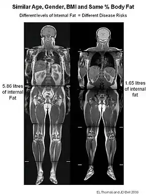 - ↑ Thomas, E. Louise; Parkinson, James R.; Frost, Gary S.; Goldstone, Anthony P.; Doré, Caroline J.; McCarthy, John P.; Collins, Adam L.; Fitzpatrick, Julie A.; Durighel, Giuliana; Taylor-Robinson, Simon D.; Bell, Jimmy D. (2011). "The Missing Risk: MRI and MRS Phenotyping of Abdominal Adiposity and Ectopic Fat". Obesity. 20 (1): 76–87. doi:10.1038/oby.2011.142. PMID 21660078. S2CID 22489848.