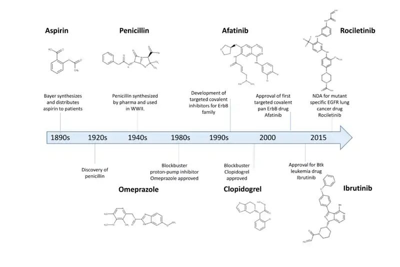 - 1 2 3 Singh J, Petter RC, Baillie TA, Whitty A (April 2011). "The resurgence of covalent drugs". Nature Reviews. Drug Discovery. 10 (4): 307–317. doi:10.1038/nrd3410. PMID 21455239. S2CID 5819338.