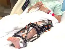 The Taylor Spatial Frame (TSF) is an external fixator used by paediatric and orthopaedic surgeons to treat complex fractures[1] and bone deformities. The medical device shares a number of components and features of the Ilizarov apparatus. The Taylor Spatial Frame is a hexapod device based on a Stewart platform, and was invented by orthopaedic surgeon Charles Taylor. The device consists of two or more aluminum or carbon fibre rings connected by six struts. Each strut can be independently lengthened or shortened to achieve the desired result, e.g. compression at the fracture site, lengthening, etc. Connected to a bone by tensioned wires or half pins, the attached bone can be manipulated in three dimensions and 9 degrees of freedom. Angular, translational, rotational, and length deformities can all be corrected simultaneously with the TSF.