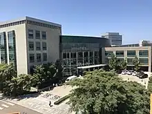 Jacobs Medical Center (32°52′40″N 117°13′36″W / 32.877659°N 117.226584°W) opened on November 20, 2016.[4] It is the second component of UC San Diego Health's two-campus strategy and provides specialized quaternary care not available elsewhere in San Diego County. The 364-bed advanced medical center is divided into four separate pavilions: Thornton Pavilion, Vassiliadis Pavilion (floors 2–3), Foster Pavilion (floors 4–6), and Rady Pavilion (floors 8–10). The A. Vassiliadis Family Pavilion for Advanced Surgery includes intraoperative MRI machines and the only Restrictive Spectrum Imaging facility in the United States. The Pauline and Stanley Foster Pavilion for Cancer Care houses a blood and marrow transplant program jointly operated by UC San Diego Health and Sharp Healthcare, the floor for which is completely pressurized and filtered allowing patients to roam freely. The Rady Pavilion for Women and Infants includes a Level III Neonatal Intensive Care Unit, eight labor rooms, 32 private postpartum rooms, and a three-room midwifery birth center.[5] Each of the hospital's private rooms is equipped with an Apple iPad for controlling lighting, checking medical records, and contacting care providers.[4] The facility is named for Joan and Irwin Jacobs in recognition of a $75 million gift they made to support its construction.