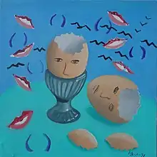 In Bryan Charnley's self portrait, he expresses his fear about individuals accessing into his thoughts through telepathy. The cracked eggs symbolizes his mind devoid of its contents, while the birds taking flight represent his thoughts.[7]