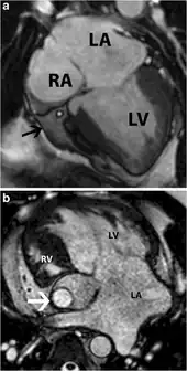 Tricuspid atresia is a form of congenital heart disease whereby there is a complete absence of the tricuspid valve.[2] Therefore, there is an absence of right atrioventricular connection.[2] This leads to a hypoplastic (undersized) or absent right ventricle. This defect is contracted during prenatal development, when the heart does not finish developing. It causes the systemic circulation to be filled with relatively deoxygenated blood. Because of this, hypoxia occurs, so other defects must occur to maintain blood flow. Because of the lack of an atrioventricular connection, an atrial septal defect (ASD) must be present to fill the left atrium and the left ventricle with blood.[3] Since there is a lack of a right ventricle, there must be a way to pump blood into the pulmonary arteries, and this is accomplished by a ventricular septal defect (VSD). The causes of tricupsid atresia are unknown.[4]
