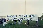 The Democratic Party's platform endorses the abortion-rights position, stating that abortion should be "safe and legal".[23] Not all Democrats agree with the platform, however, and there is a small anti-abortion faction within the party, expressed in such groups as Democrats for Life of America.[24] Similarly, there is a small abortion-rights faction within the Republican Party. The Libertarian Party platform holds "that government should be kept out of the matter" of abortion.[25]