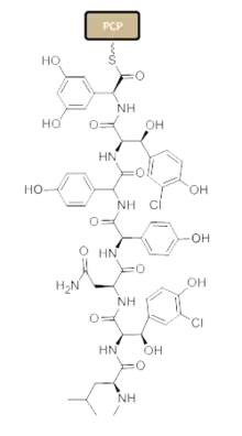 - ↑ Schmartz PC, Zerbe K, Abou-Hadeed K, Robinson JA (August 2014). "Bis-chlorination of a hexapeptide-PCP conjugate by the halogenase involved in vancomycin biosynthesis". Organic & Biomolecular Chemistry. 12 (30): 5574–7. doi:10.1039/C4OB00474D. PMID 24756572. Archived from the original on 27 August 2021. Retrieved 23 June 2020.