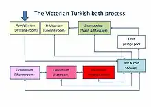 The Victorian Turkish bath is a type of bath in which the bather sweats freely in hot dry air, is then washed, often massaged, and has a cold wash or shower.[1] It can also mean, especially when used in the plural, an establishment where such a bath is available.