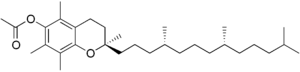 The synthetic product is all-rac-alpha-tocopherol,[29] also referred to as dl-alpha tocopherol. It consists of eight stereoisomers (RRR, RRS, RSS, RSR, SRR, SSR, SRS and SSS) in equal quantities. "It is synthesized from a mixture of toluene and 2,3,5-trimethyl-hydroquinone that reacts with isophytol to all-rac-alpha-tocopherol, using iron in the presence of hydrogen chloride gas as catalyst. The reaction mixture obtained is filtered and extracted with aqueous caustic soda. Toluene is removed by evaporation and the residue (all rac-alpha-tocopherol) is purified by vacuum distillation."[29] The synthetic is in contrast to what is extracted from plants, all RRR-alpha tocopherol, referred to as d-alpha-tocopherol. The synthetic has 73.5% of the potency of the natural.[30] Manufacturers of dietary supplements and fortified foods for humans or domesticated animals convert the phenol form of the vitamin to an ester using either acetic acid or succinic acid because the esters are more chemically stable, providing for a longer shelf-life.[2][31]