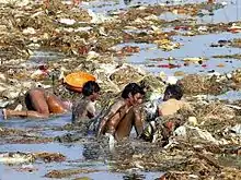 Water pollution is a major environmental issue in India. The largest source of water pollution in India is untreated sewage.[1] Other sources of pollution include agricultural runoff and unregulated small-scale industry. Most rivers, lakes and surface water in India are polluted due to industries, untreated sewage and solid wastes.[2][3] Although the average annual precipitation in India is about 4000 billion cubic metres, only about 1122 billion cubic metres of water resources are available for utilization due to lack of infrastructure.[4] Much of this water is unsafe, because pollution degrades water quality. Water pollution severely limits the amount of water available to Indian consumers, its industry and its agriculture.