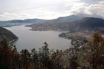 The lake is drained by the Michatoya River which is a tributary of the María Linda River and the town of Amatitlán is located at the head of the Michatoya river. A dam with a railway on top was constructed at the narrowest point, thus effectively dividing the lake into two water bodies with different physical, chemical and biological characteristics. The lake is used as a water source for navigation and transportation, sightseeing and tourism, recreation, and fisheries.[6]
