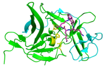 | NS2B | A cofactor for NS3 and together forms the NS2B-NS3 protease complex, contains transmembrane domains which bind the protease to intracellular membranes.[18][24] |