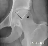 - Reimer's migration index (MI), also called the femoral extrusion index,[3] is calculated if hip dysplasia is detected. It can be used to indicate hip dislocation. It is the horizontal distance (parallel to the Hilgenreiner Line) between the Perkin line and the lateral border of the ossification center of the femoral head, divided by the horizontal width of the ossification center. The migration index is normally less than 33% by most sources,[9] but 25% and 30% has also been suggested.[10]