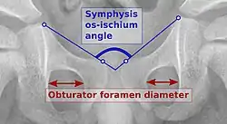 - Obturator foramen diameter ratio (of Tönnis): A quotient of pelvic rotation by dividing the horizontal diameter of the obturator foramen of the right side and that of the left. In neutral rotation the ratio is 1 but is considered to be acceptable when it is between 0.56 and 1.8.[3]