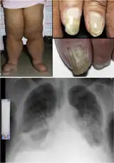 Yellow nail syndrome is a condition that presents with thick yellow nails, lymphedema, and lung disease; though these symptoms may not all occur at the same time.[2][3] Generally, two of the three features are required to make the diagnosis.[4] All the nails are generally affected and they do not grow.[5] Over half of cases have respiratory symptoms; the most common being cough and pleural effusion, and less frequently bronchiectasis, pneumonia, sinusitis, and lung fibrosis.[4] The lymphedema typically occurs in both legs, with or without pitting.[4]