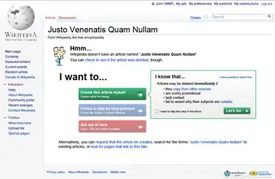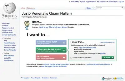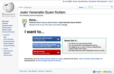 - Redlink: They follow a redlink, which leads them directly to the edit page where they can create the article. Again, they have no introduction to the Wikipedia guidelines for new articles.