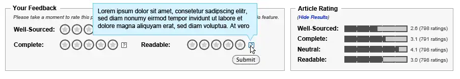 Ideally, the two sections will not be placed in close proximity on the page. However, several factors prevent this from occurring during the pilot (including but not limited to expected resistance from readers and editors to placing the Rating Display box in a more prominent position).