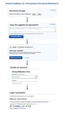 This proposed call to action would invite anonymous users ("anons") who post comments to enter their email address, so we can notify them if their comment is used. (Note that this idea would conflict with another proposal to require anonymous users to sign up to leave comments, as outlined above). In July 2012, a first prototype was created to illustrate an possible workflow leading to this CTA (click through all the options to see it at the end of the process). This approach is intended to give unregistered users an invitation to register if they are interested in tracking their feedback after they posted it.