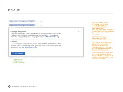 Flyout dialogs are control panels which are tightly coupled to their activation affordance. Flyout dialogs are similar to tooltips but are typically more robust in function.