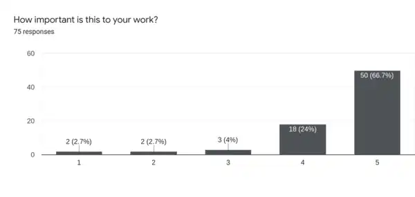 In total, we received 75 responses. Of those, 60 came from Wikimedia staff/Contractors, additionally, 11 were from Volunteers and just 4 were from 3rd Party Contributors.