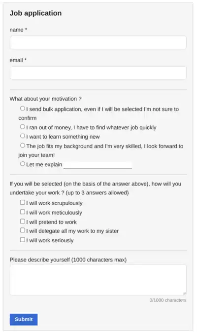 This is an example pdf output of the form above "Job application", either received by email if the parameter email-to is used (see section below for more detail) or clicking the download button in the submissions table.