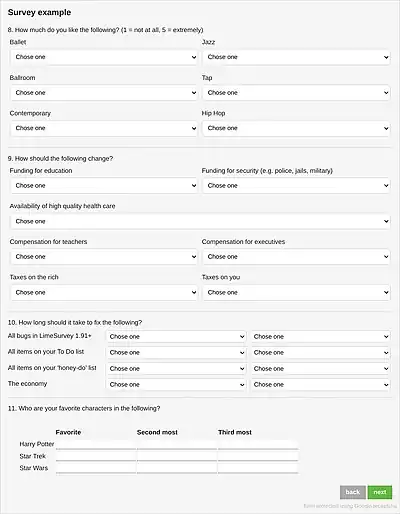 the demo tries to emulate the full list of inputs offered by LimeSurvey however, although CIForms provides native validation whenever possible, it currently misses some input types, specifically the QArray* inputs and conditional display.