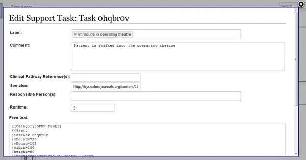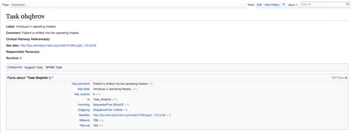 This is an examplary wiki page that represents a BPMN element. It contains among other information like position, height, width and label of the BPMN element. Additional information can be added to the wiki page in order to annotate the element.