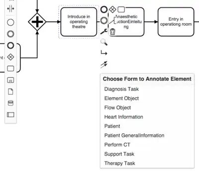 In order to annotate a BPMN element by using Semantic Forms, click on the element so that the contex tmenu appers. Afterwards click on the magnifier. Afterwards, all available Forms, stored in the MediaWiki, are listed. Click on the Forms with which the element should be annotated.