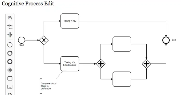 The Cognitive Process Designer extension supports the creation, importing, exporting and annotating of BPMN (Business Process Model and Notation) processes by using an intuitive GUI (graphical user interface). Each element (node and edge) is represented by its own wiki page, which publishes the information according to the Linked Data Principles. Cognitive Process is based on bpmn.io, an open source project by Camunda. Bpmn.io is an JavaScript renderer that allows to model BPMN processes and checks the syntax. Semantic Forms is used to facilitate the input of information for each element.