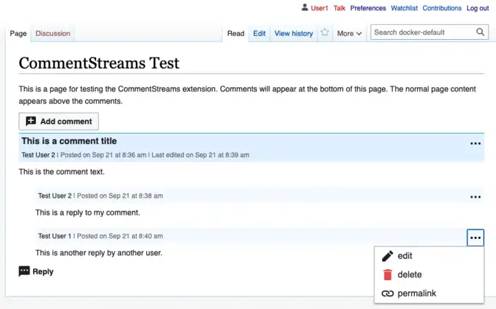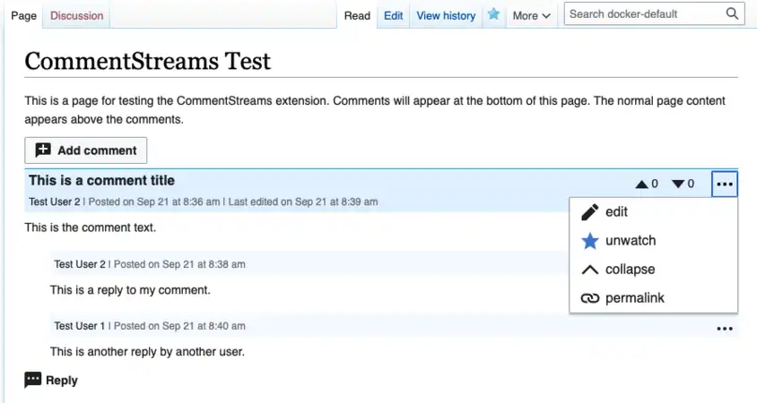 CommentStreams is a commenting system for wikis. Users can post comments below the content on a wiki page. The comments are displayed with the user's username, linked to their user page if it exists, the creation and last modification dates of the comment, and an optional user avatar. Comments can be edited and deleted only by the comment author. Comments are added in streams which include a title and a head comment that can be replied to by other comments.
