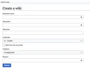- Special:CreateWiki — which allows some users to create new wiki sites