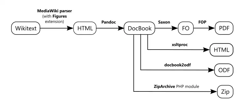 The following diagram shows how the various software and utilities are used together to create the different output formats that DocBookExport supports, and hopefully makes it easier to understand which dependencies are needed for which outputs. Note that docbook2odf comes pre-bundled with the html_to_docbook library; the rest would need to be installed individually, if they are not already on your system.