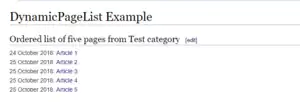 DynamicPageList can be used with XML-like syntax in the wiki edit view. The parameters control the pages to list, order, and display mode. See the following sections for information on each parameter. For example, the following are the oldest five pages on this wiki that were recently moved to MediaWiki.org.
