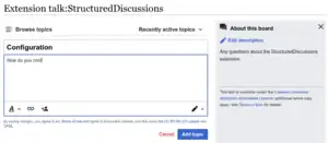 The StructuredDiscussions extension provides a discussion and collaboration system for talk pages. This page covers how to install and administer Structured Discussions; for a guide to using it, see Help:Structured Discussions. You can try out Structured Discussions yourself at the Sandbox talk page.
