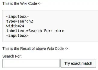 | inline= | Make the InputBox be an inline element (no line break at beginning). | search2 | <translate nowrap><!--T:98--> Text here:</translate> <inputbox>
