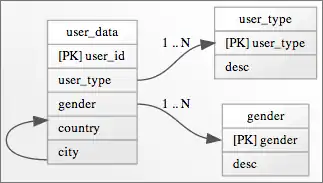 <quickgv name="ER_Model" usage="er"> // node 123456789012345678901 A [label="<fT> user_data | <fPK> [PK] user_id\l | <f0> user_type\l | <f1>gender\l | <f2> country\l | <f3> city\l }"]; B [label="<fT> user_type | <fPK> [PK] user_type\l | desc\l"]; C [label="<fT> gender | <fPK> [PK] gender\l | desc\l"]; // edges A:f0 -> B:fPK [label="1 .. N"]; A:f1 -> C:fPK [label="1 .. N"]; A:f3 -> A:f2; </quickgv>