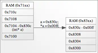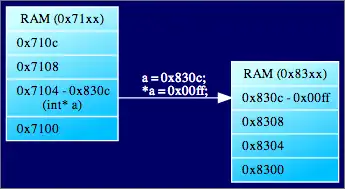 <quickgv name="Pointer1" usage="ram"> A [label="RAM (0x71xx) | 0x710c\l | 0x7108\l | <fsrc> 0x7104 - 0x830c\l (int* a) | 0x7100\l "]; B [label="RAM (0x83xx) | <fdst> 0x830c - 0x00ff\l | 0x8308\l | 0x8304\l | 0x8300\l"]; A:fsrc -> B:fdst [label="a = 0x830c;\l*a = 0x00ff;\l"]; </quickgv>