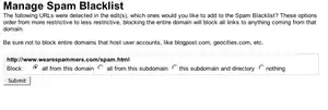 | Description | Allows privileged users to add entries to the spam blacklist right off of a diff page |