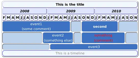 <timelinetable title="This is the title" footer="This is a timeline"> 2008-01|2009-06|event1|some comment 2008-12|2009-07|event2|something else 2009-02|2010-12|event3 </timelinetable>