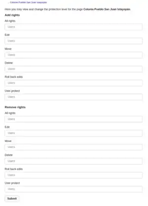 A user with the userprotect right is provided with the "User protect" item in the page actions menu. Click it to add or remove allowed restrictions to the current page on per-user basis. Just start typing user names in the appropriate right field. Each field allows multiple values and autocompletes as you type. Once you are done, submit the form.