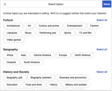 - In watching user behavior after the deployment of topic matching on 2020-01-21, we see that about 75% of users who have the option to choose topics actually choose some. Though we'll need to take more time to see how topics have impacted the rate that users do suggested edits, this initial number is a good sign that users are interested in using topics.