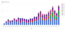 The number of suggested edits completed by each wiki each week, going from December 2019 to November 2020, with a line for the total.