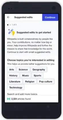 - The first version of the newcomer tasks workflow (V1.0) will be deployed in the next weeks on our 4 priority wikis. This version will suggest articles to edit based on maintenance templates. In this first version, we expect many newcomers to initiate the workflow, but not many to select articles to edit or complete edits. We expect future versions of the feature to increase those behaviors.