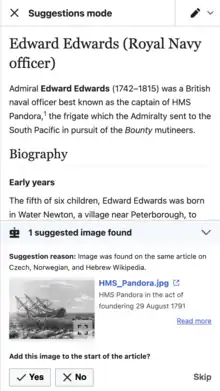 - "Add an image" is the team's second structured task, currently in development. It is an editing task that suggests Commons images for unillustrated Wikipedia articles. We have conducted many community discussions and tests. Then, we've decided to build a first prototype. We'll first deploy it only to our pilot Wikipedias, to learn whether newcomers can be successful with the task. The project page contains links to interactive prototypes. We are very interested to hear your thoughts on this idea as we build and test the early versions. These prototypes have already been tested by newcomers, in English and Spanish.
