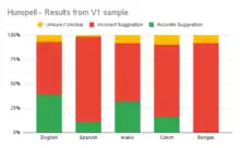 The precision for Hunspell copy edits were judged less than 40% accurate across all wikis. Suggestions were accurate for 39% of English suggestions, 11% for Spanish, and 32% for Arabic, 16% for Czech, and 0% for Bengali.