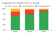 LanguageTool second evaluation (V2 sample): We completed a second evaluation of LanguageTool as a way to surface copy edits in Wikipedia articles. We evaluated suggested errors in Arabic, English, and Spanish. In the previous evaluation we determined that certain rules often resulted in incorrect suggestions, so we added functionality to filter certain rules. You can see that we ended with results with a higher level of accuracy than in the V1 sample.