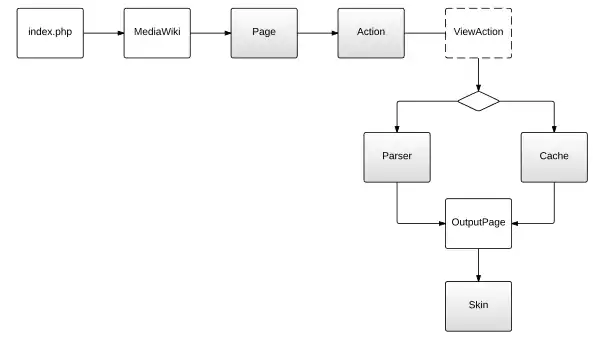 During the initial stage only some key modules were described. The reason for selection of these initial modules is their high-level presence in the fulfillment of a basic request to show a page. On the figure below we can see a flowchart that represents a sequential participation of modules during the execution of a request. Every request is received by index.php, where an object MediaWiki is created. After that a Page from Page module is initialized together with an Action that will be performed on it (from Action module). Depending on the Action several other modules can participate in the request execution. If it is a view request for a normal article, than either Parser module to parse the page or Cache module to retrieve the page from cache will be called. The Cache module is responsible for many types of caching, but at this point of request processing only the parser cache is relevant. Eventually an OutputPage object will be filled with necessary data coming from Parser or Cache and the Skin module will take care of its output as an HTML.