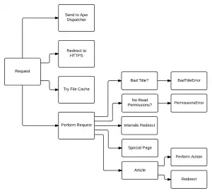 MediaWiki is a helper class for the index.php entry point, it controls the full cycle of request processing. MediaWiki fulfills the incoming request starting by determining the right handling: it can be redirect to an Ajax dispatcher (if the request is an Ajax request), redirect to HTTPS (if the request requires HTTPS), it can be served with file cache (if enabled and available) and finally if nothing of the above is applicable, the request will be proceeded further.