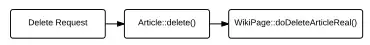 For example, if an article needs to be deleted, i.e 'delete' request is received, Article class will handle all the necessary preprocessing: it will check the permissions, check that article has not been deleted yet, generate deletion reason etc. After verifying that everything is correct, it will call the actual deletion method on WikiPage, that will use database objects to write changes to the database. This process is shown on figure Handling of article deletion.