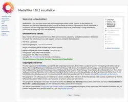 For reference (in case you want to go there directly), this is located in MediaWiki'smw-configdirectory (so using the example above you would go tohttp://www.example.com/mw-config/, or on a local machinehttp://localhost/mw-config/). - After selecting the language, the configuration script performs some environmental checks.